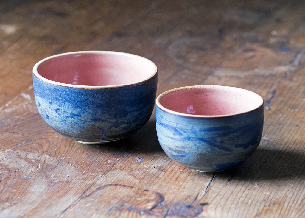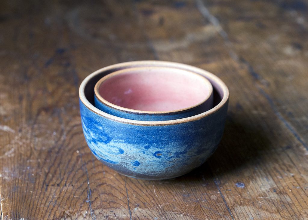 A pair of matching nested bowls with a matt, textured blue exterior and glossy, rose pink interior.